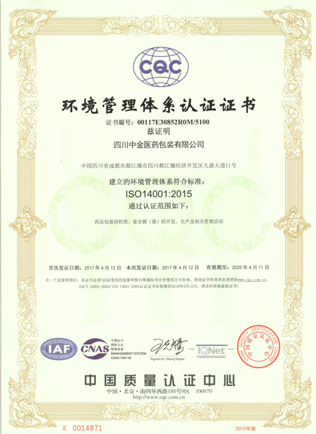 環(huán)境管理認(rèn)證體系證書